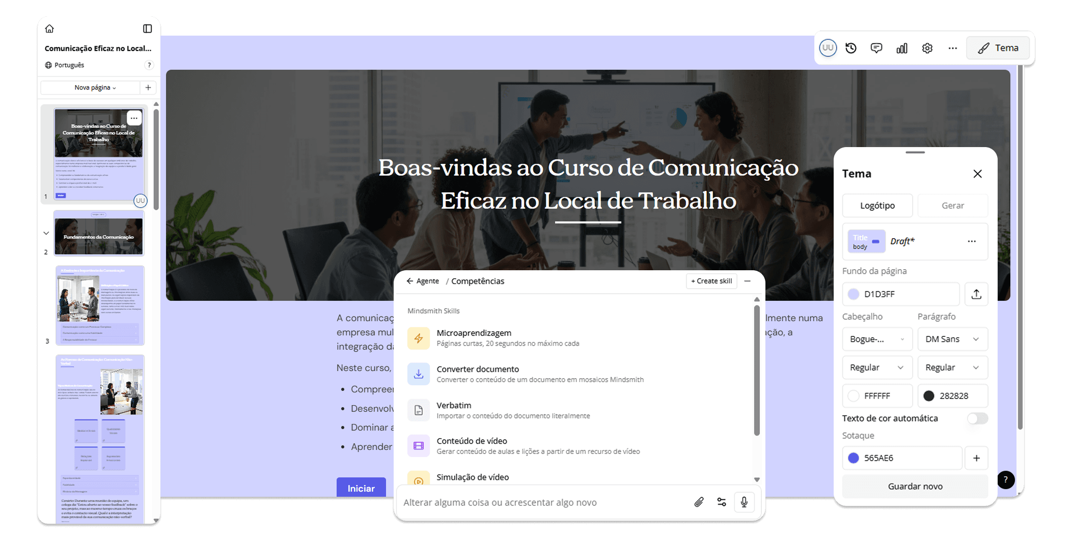 Suba um documento, apresentação ou procedimento existente ou apenas descreva o que o curso precisa cobrir. A IA interpreta e organiza.